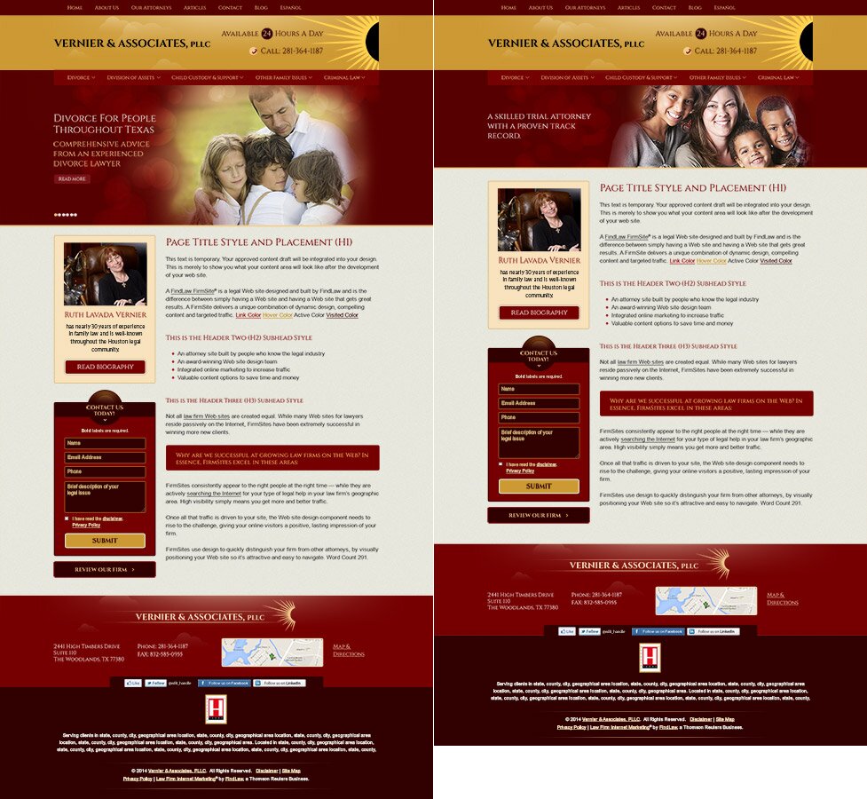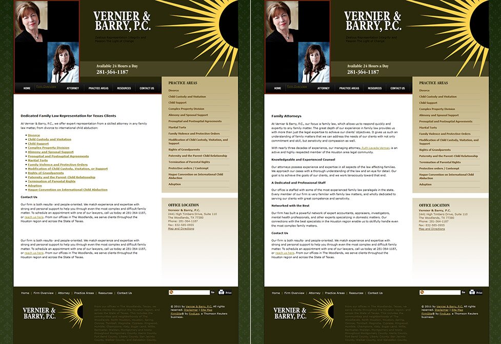 The overall layout is clean, open and easy to navigate. The practice areas are in 5 main categories for better usability and to increase conversion. We changed the color scheme from green to maroon because we wanted a color that was bold and would draw users in, but also a warm and strong color. Red shows strength, power and passion, but we didn’t want to use too bright of a color, so toning it down to maroon was a nice balance and still has the warm, strong, passionate tone that fits with the subject matter of the Vernier & Associates, PLLC practice. The firm logo and animated sun is incorporated at the top of the page and we have a strong call to action. The hero images are practice focused with supportive text.